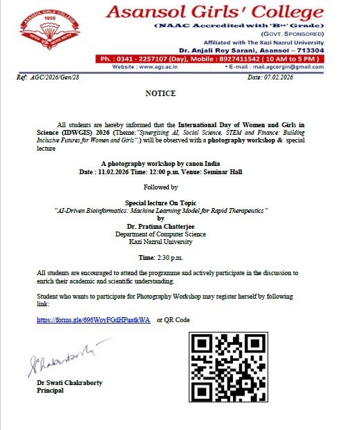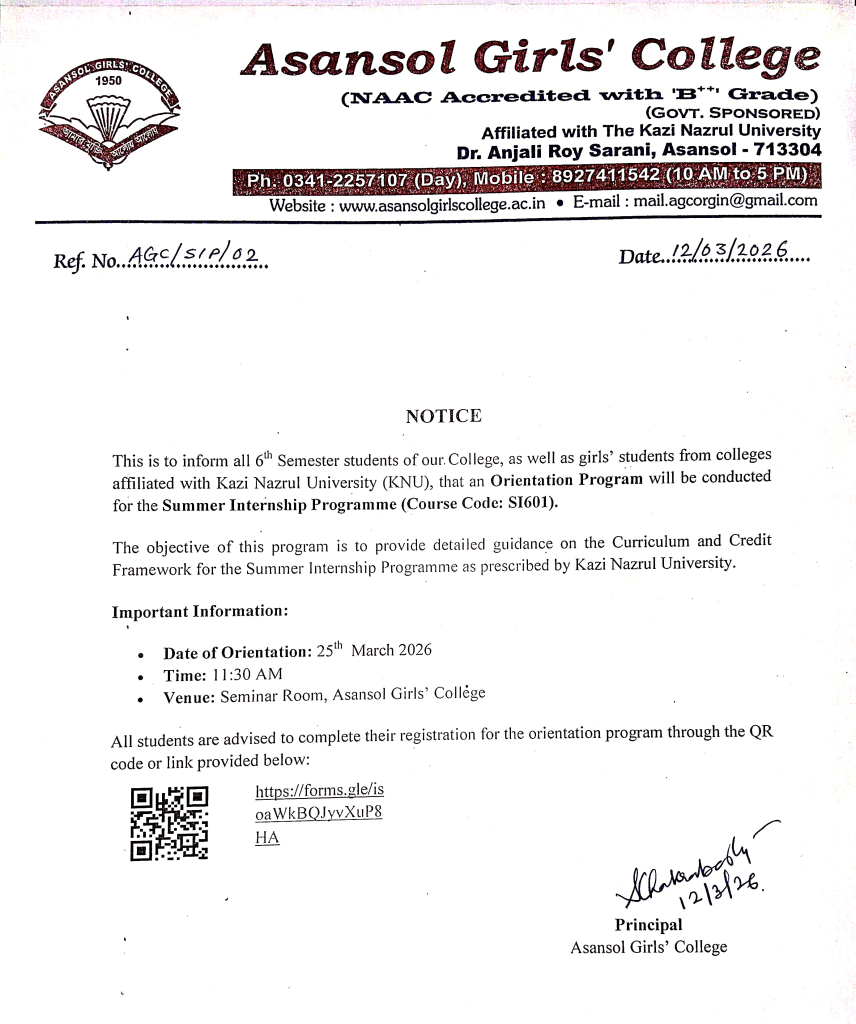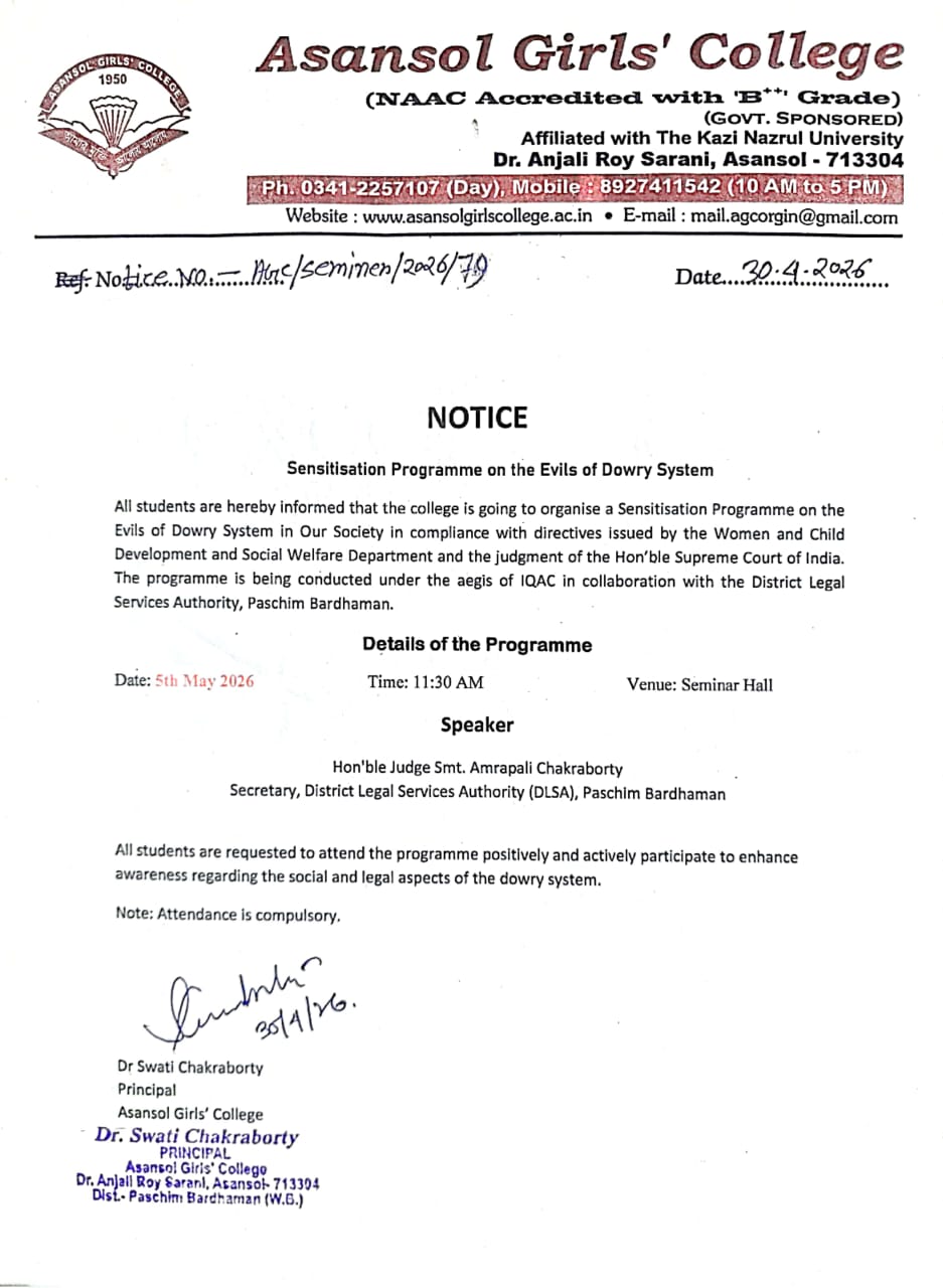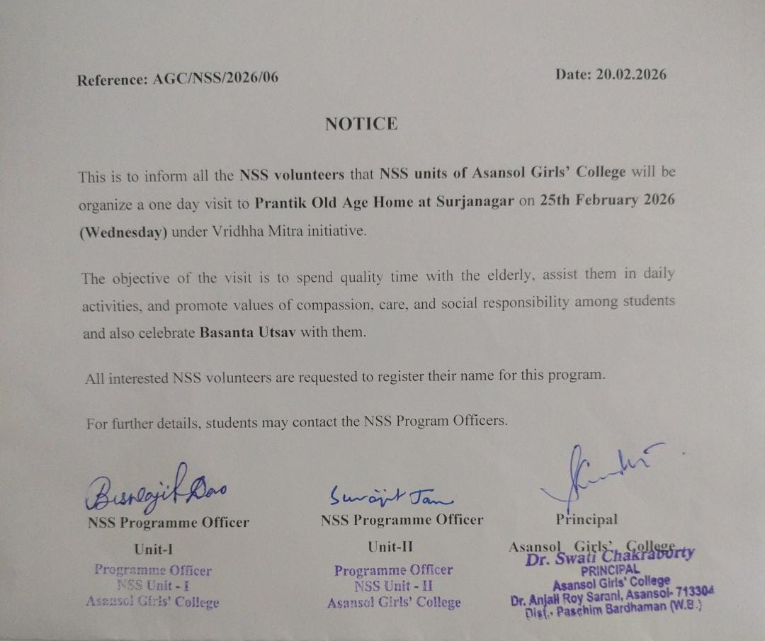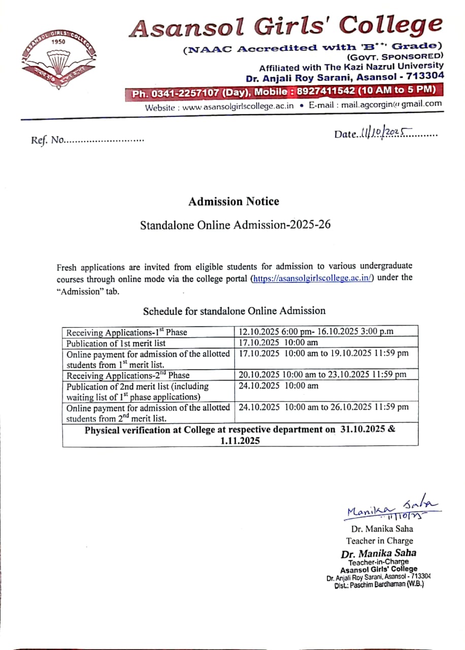 Asansol Girls’ College, affiliated to Kazi Nazrul University, stands as a beacon of women’s education in this region a sanctuary of learning, aspiration, and empowerment since 1950. Founded through the vision and dedication of Dr. Lalit Mohan Sen and Smt. Kamala Sen, and strengthened by the untiring efforts of Dr. Anjali Roy, the College has grown from its modest beginnings at Manimala Girls’ High School into a vibrant institution that shapes dreams and transforms lives.