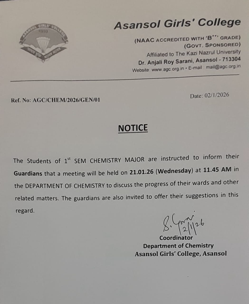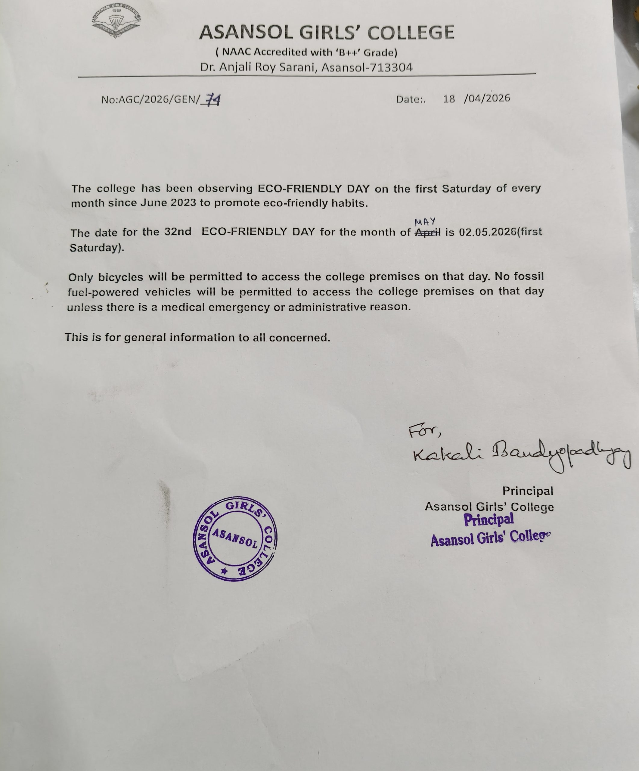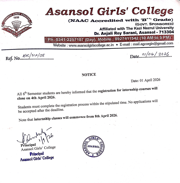Asansol Girls' College, a premier institution of this coalfield and industrial region of West Bengal came into existence in 1950 mainly as a result of untiring efforts of Dr. Lalit Mohan Sen, the then CSO, Mines Board of Health and his worthy consort Smt. Kamala Sen. From the humble beginning in the premises of the Manimala Girls' High School the college soon blossomed into maturity and was shifted to its new building in 1962. During the difficult years of its adolescence, the college was fortunate to have Dr. Anjali Roy as its principal. She was a dedicated educationist, who with the help of a team of devoted colleagues nurtured the college as one of the most prestigious institutions under the Kazi Nazrul University. In 1969 a Morning Section was opened to meet the increasing demand for higher education of girls of this area.