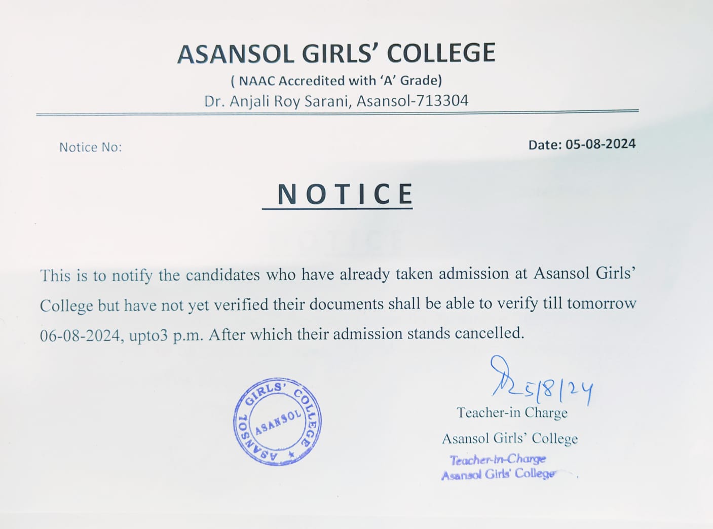 Notice for physical Verification of newly provisional admission (Phase II) |